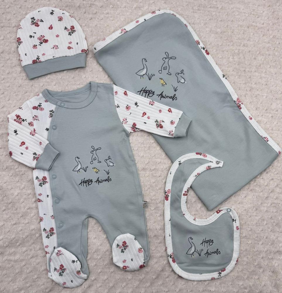 طقم استقبال مواليد هابي أنيمالز – 4 قطع – رمادي