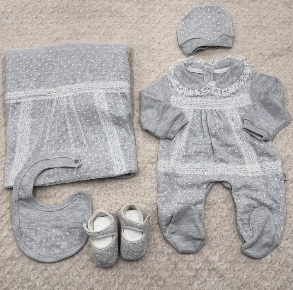 استقبال ناعم بإحساس دافئ ولمسة دانتيل أنثوية! طقم مواليد رمادي فاتح بتفاصيل نقاط منسوجة ودانتيل أبيض يمنح صغيرتك إطلالة متناسقة جاهزة للتصوير مع راحة قطنية آمنة على البشرة الحساسة.