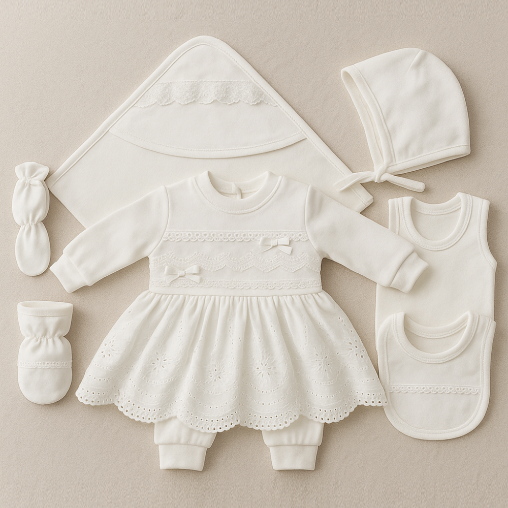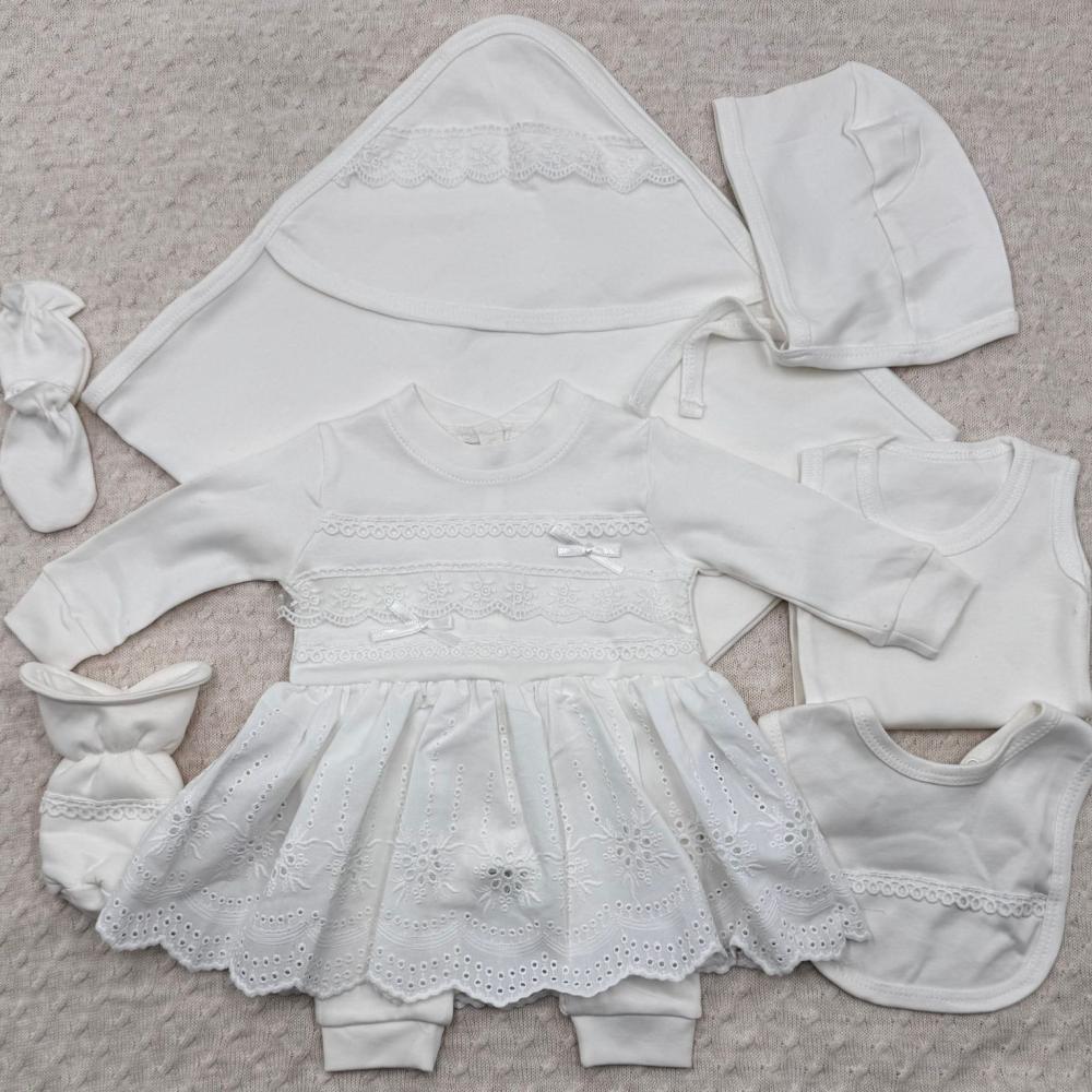 أضيفي لمسة ملكية على أول إطلالة لمولودتك مع طقم استقبال بناتي متكامل من 7 قطع باللون الأبيض مع تنسيقات دانتيل رقيقة وفستان بكرانيش ناعمة.