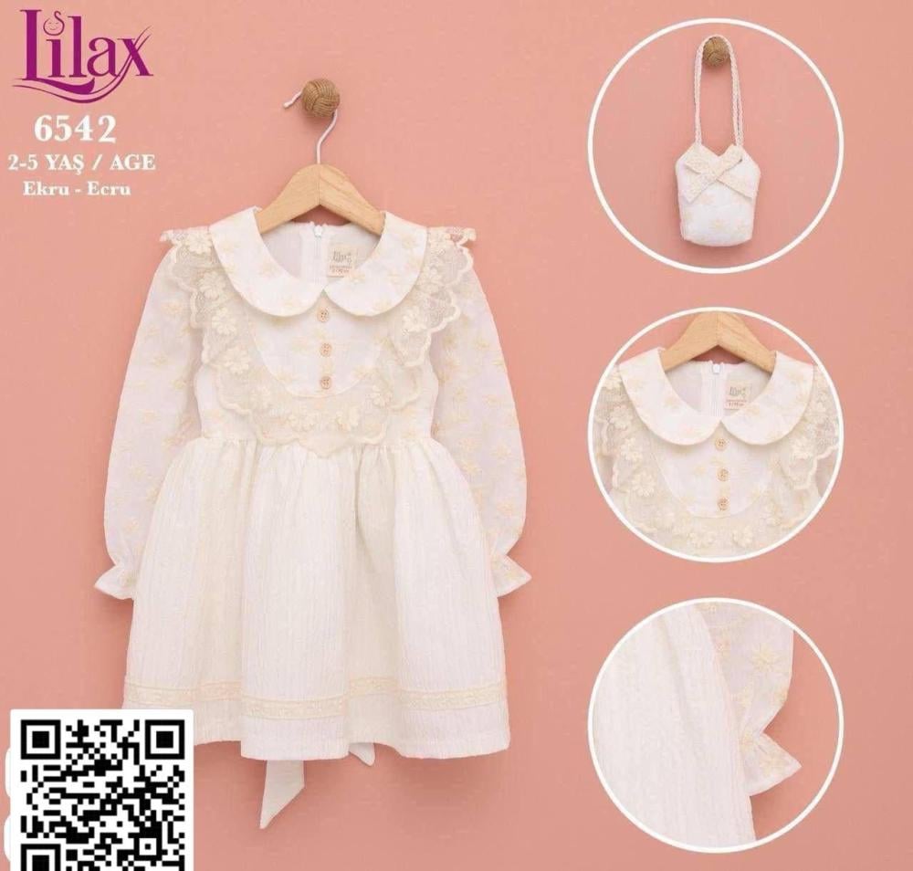 - تصميم مستوحى من فساتين الأميرات، يتميز بصدرية مغطاة بتطريزات الورد البارزة، وياقة دانتيل ناعمة، وأكمام طويلة مع نهايات مكشكشة. يكتمل الطقم بشنطة يد أنيقة.