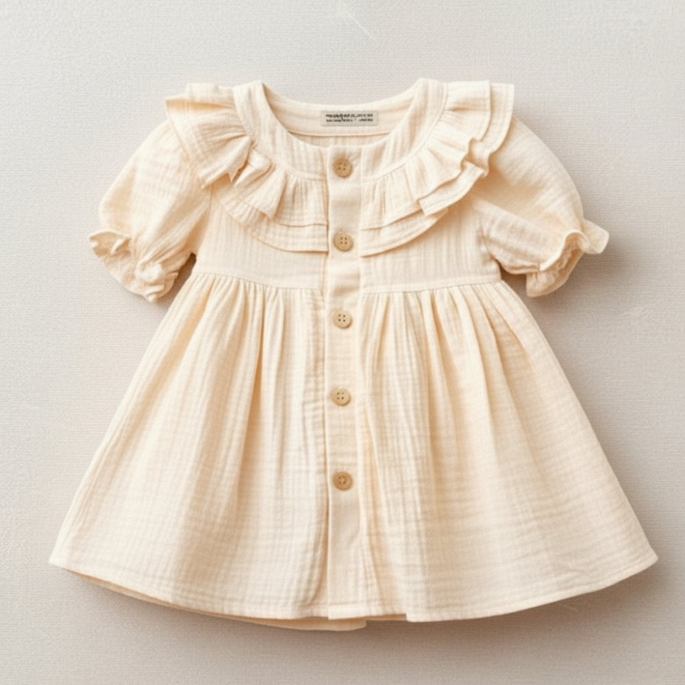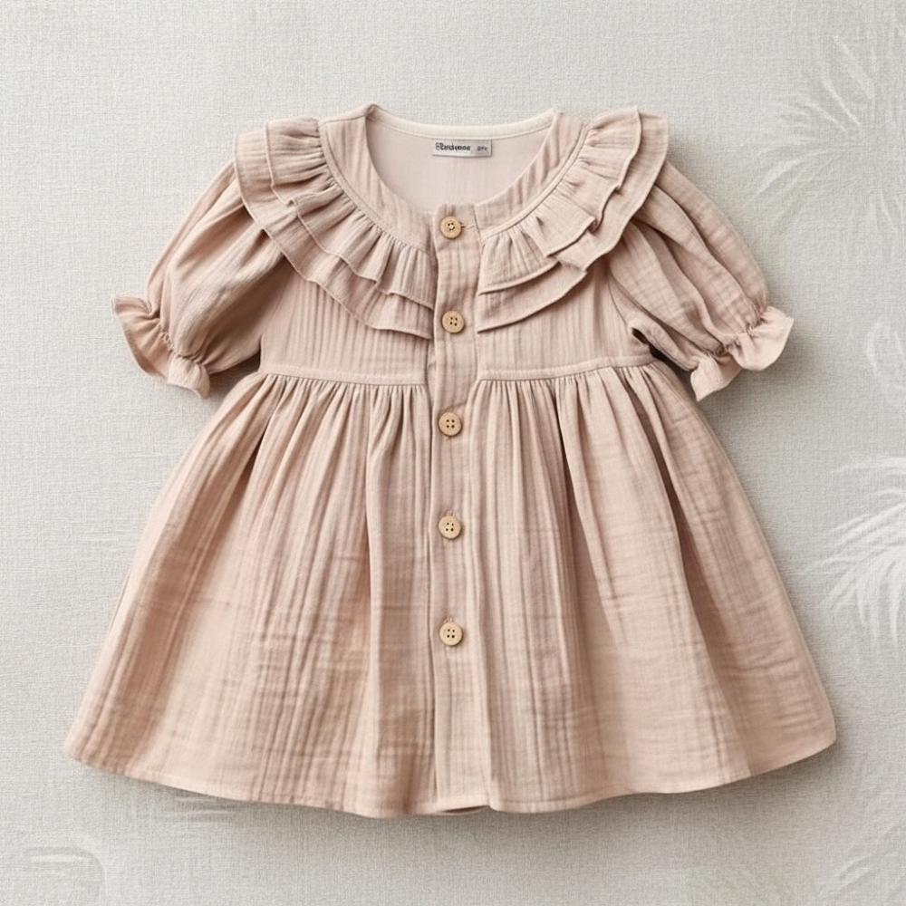 لإطلالة طفولية رقيقة ومريحة، إليكِ هذا الفستان الساحر من قماش الشاش القطني