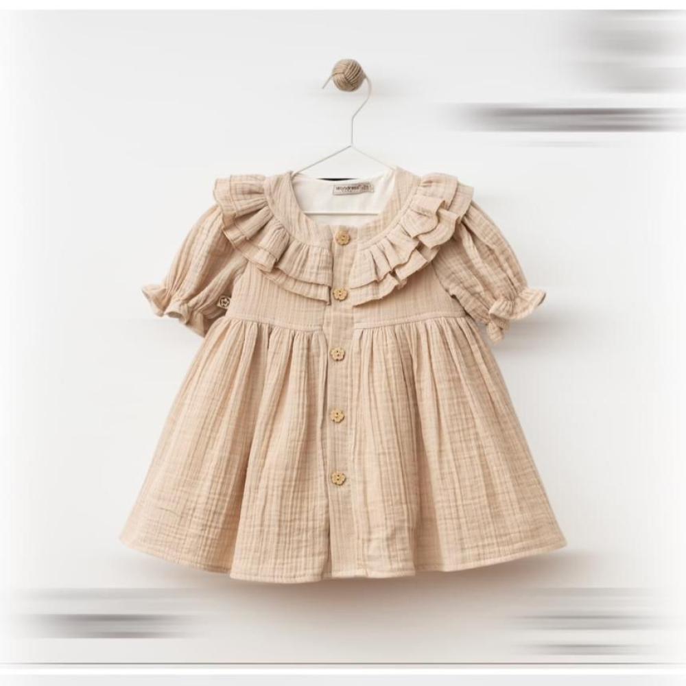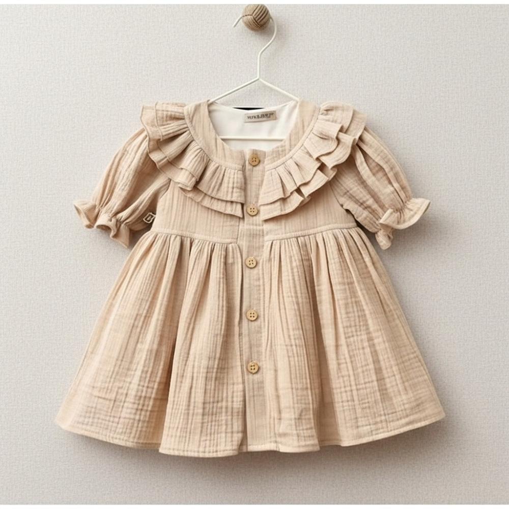 يجمع هذا الفستان بين بساطة التصميم وفخامة التفاصيل، وهو مصنوع من قماش الشاش القطني فائق النعومة ليوفر لصغيرتك راحة مطلقة ومظهرًا أنيقًا في كل الأوقات.