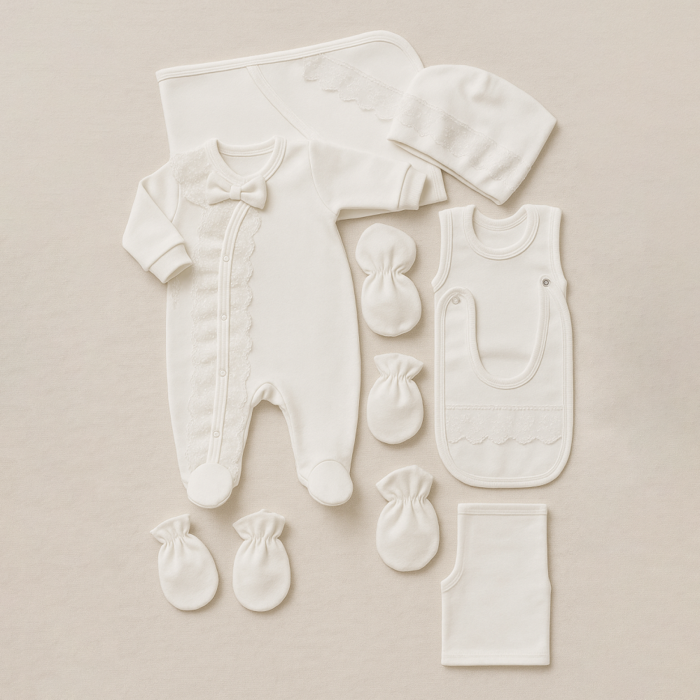 👶 استقبلي مولودكِ بإطلالة ملائكية لا تُنسى! نقدم لكِ هذا الطقم الكلاسيكي الفاخر، المصمم ليمنح صغيركِ أقصى درجات الراحة والنعومة مع لمسة من الأناقة الخالدة.