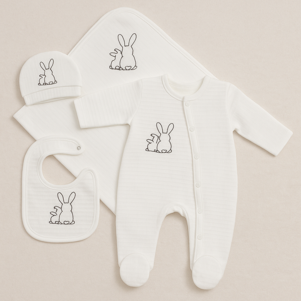 - تصميم بسيط وعصري يركز على الراحة، مع تطريز جميل لأرنبين يزين كل قطعة. الأفرول مزود بأزرار كبس كاملة لسهولة وسرعة التغيير، مما يجعله عملياً للأم والطفل.